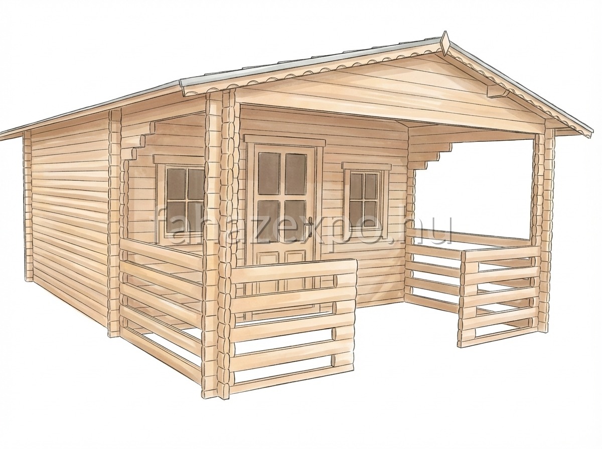 Nagyobb méretű, 24 m²-es kerti faház terasszal, 2 ablakkal, ajtóval.